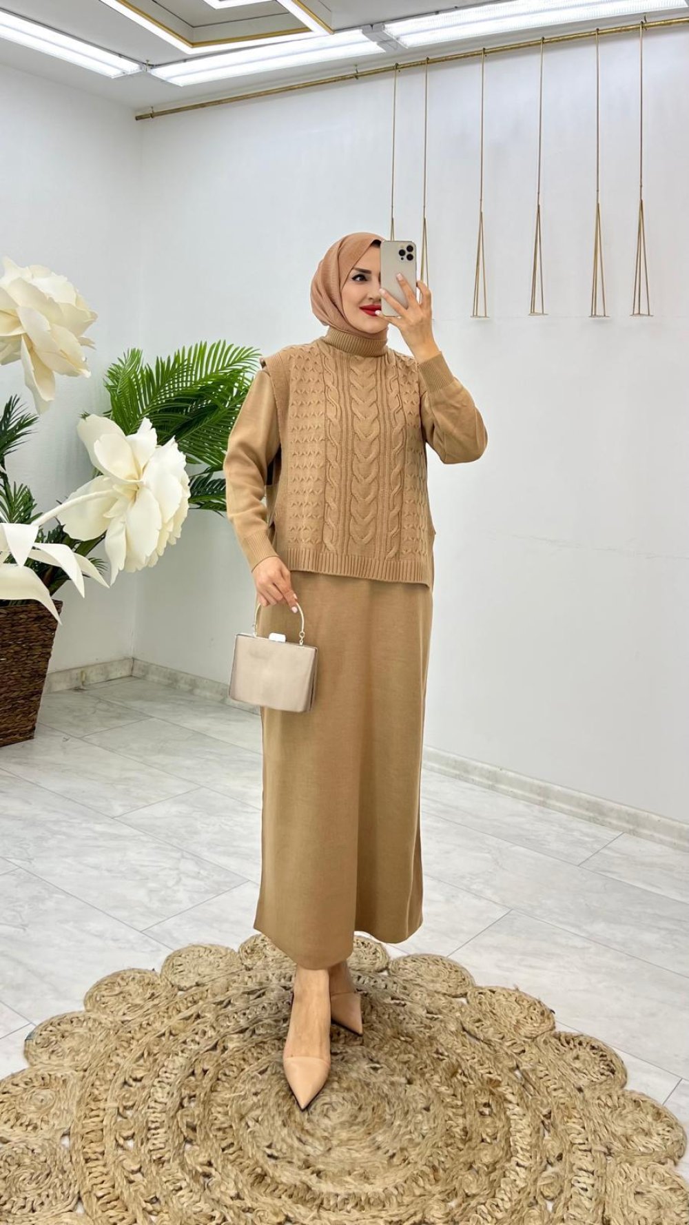 Açık Kahve Damla Triko Elbise Takım Tesettür Giyim