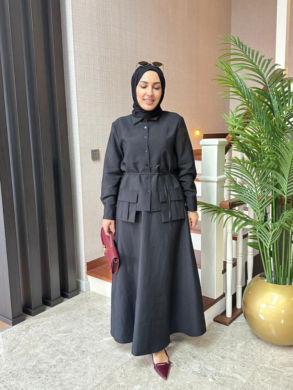 Etek boy 100 cm’dir, yadan fermuarlı ve beli lastiklidir.