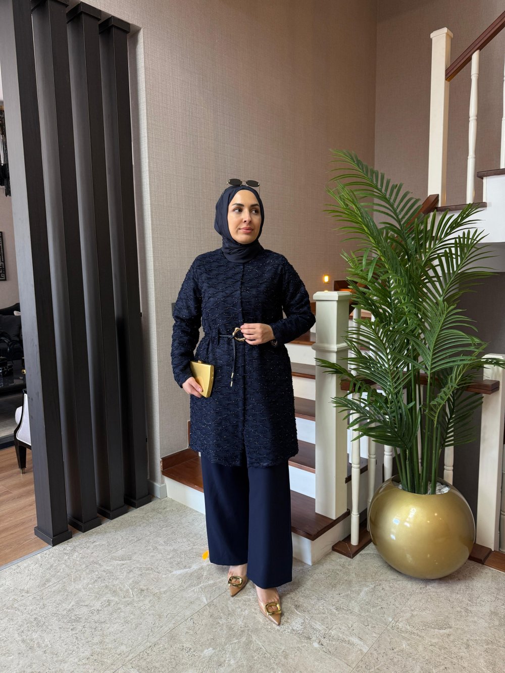 Ceket tül işleme detaylıdır, boy uzunluğu 85 cm’dir. Seyyar deri gold tokalı kemeri bulunmaktadır.