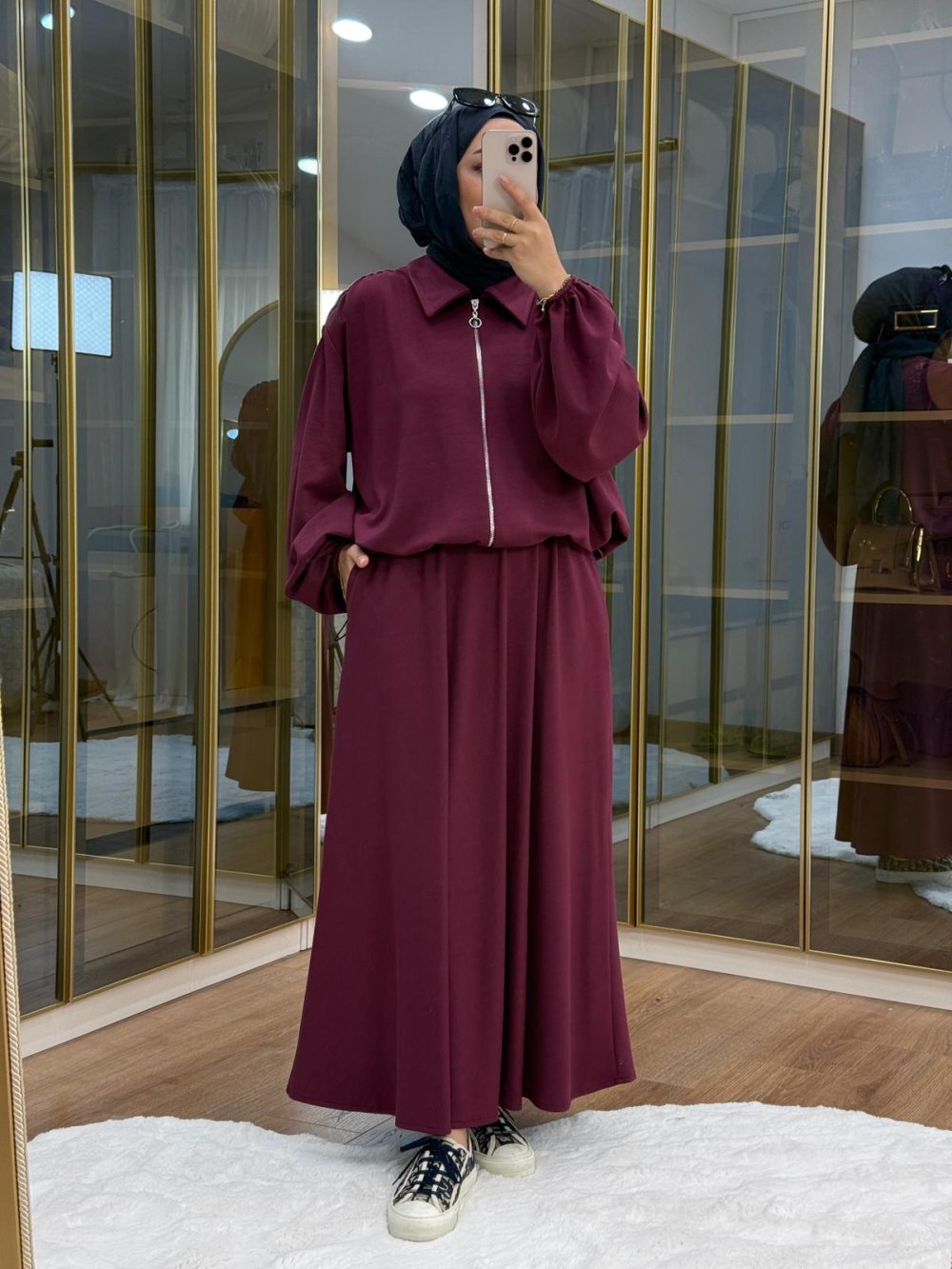 Omuzu Büzgülü Ceket Etek Takım Mürdüm