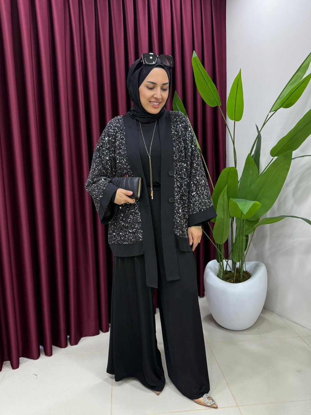 Payetli Üçlü Takım Siyah