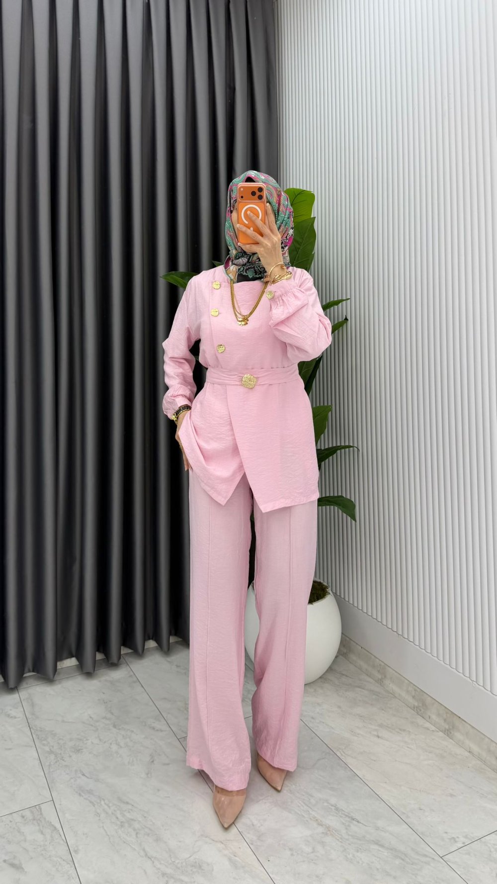 Pembe Premium Kemerli Gözde Takım Tesettür Giyim