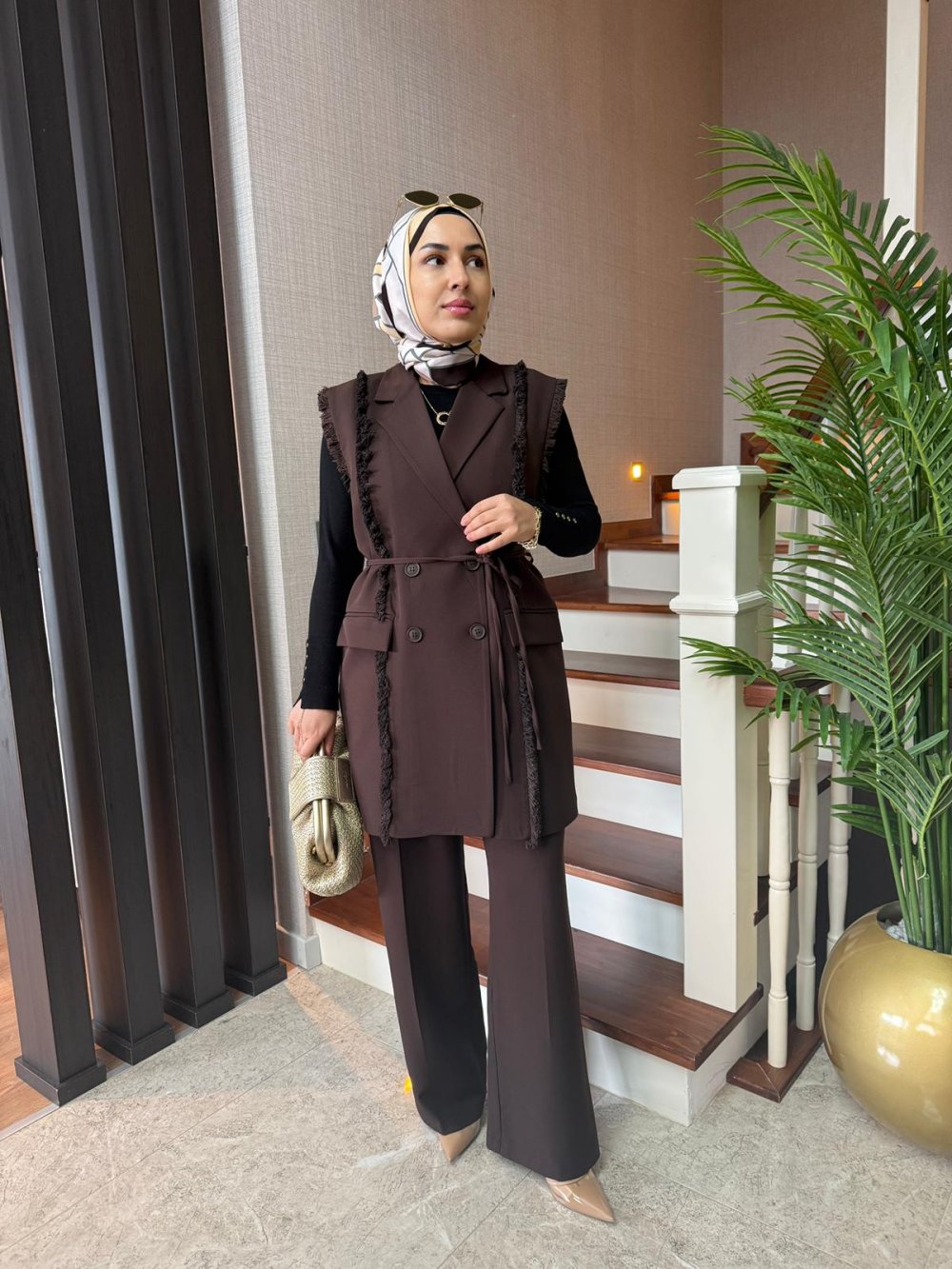 Yelek komple astarlıdır, püskül detaylıdır, boy uzunluğu 85 cm’dir.