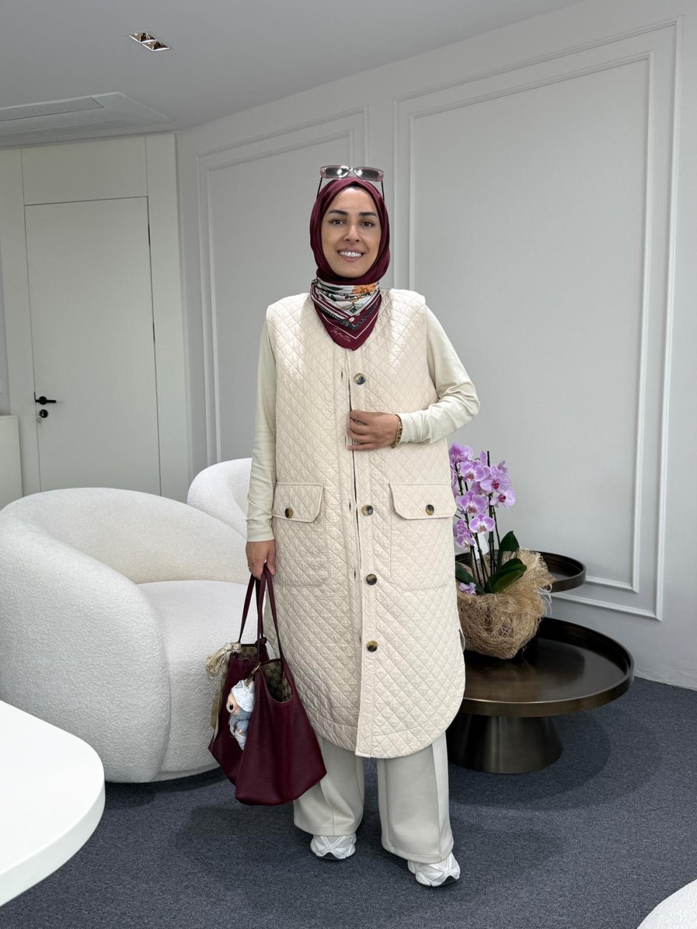 Uzun Kapitone Yelek Bej